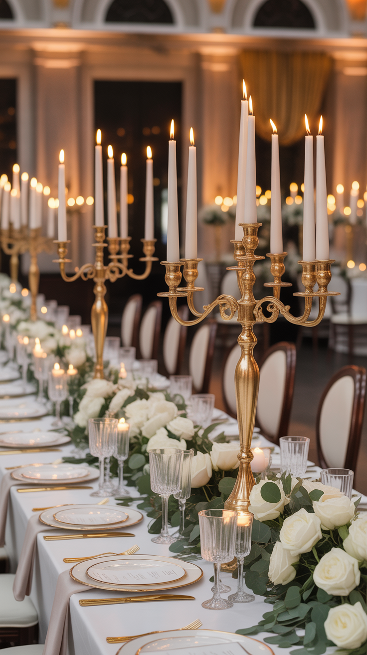 Mixing tall and low centerpieces adds interest while keeping the palette cohesive. Gold metal candle holders are perfect for adding warmth and height without introducing bold color.