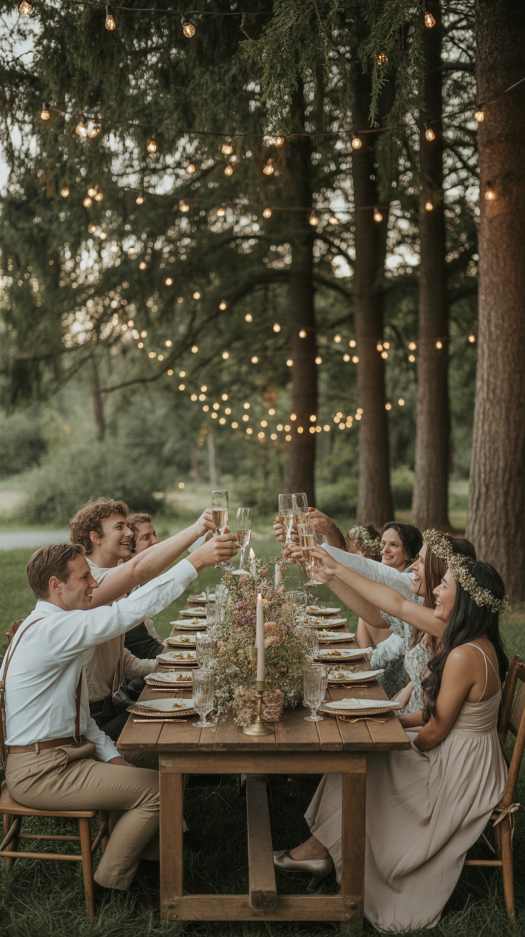 I love forest receptions that lean into warm lighting, long tables, shared dishes, and open seating. Overly formal setups can feel out of place in a natural setting, while thoughtful simplicity feels intentional.