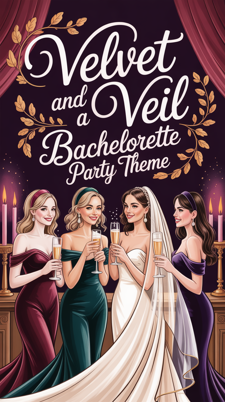 A Velvet and a Veil bachelorette party theme blends romance and boldness in such a beautiful way. It can lean dark and moody, or soft and ethereal. It works for a hotel suite, an at-home glam night, a dinner party, or a cozy winter celebration.